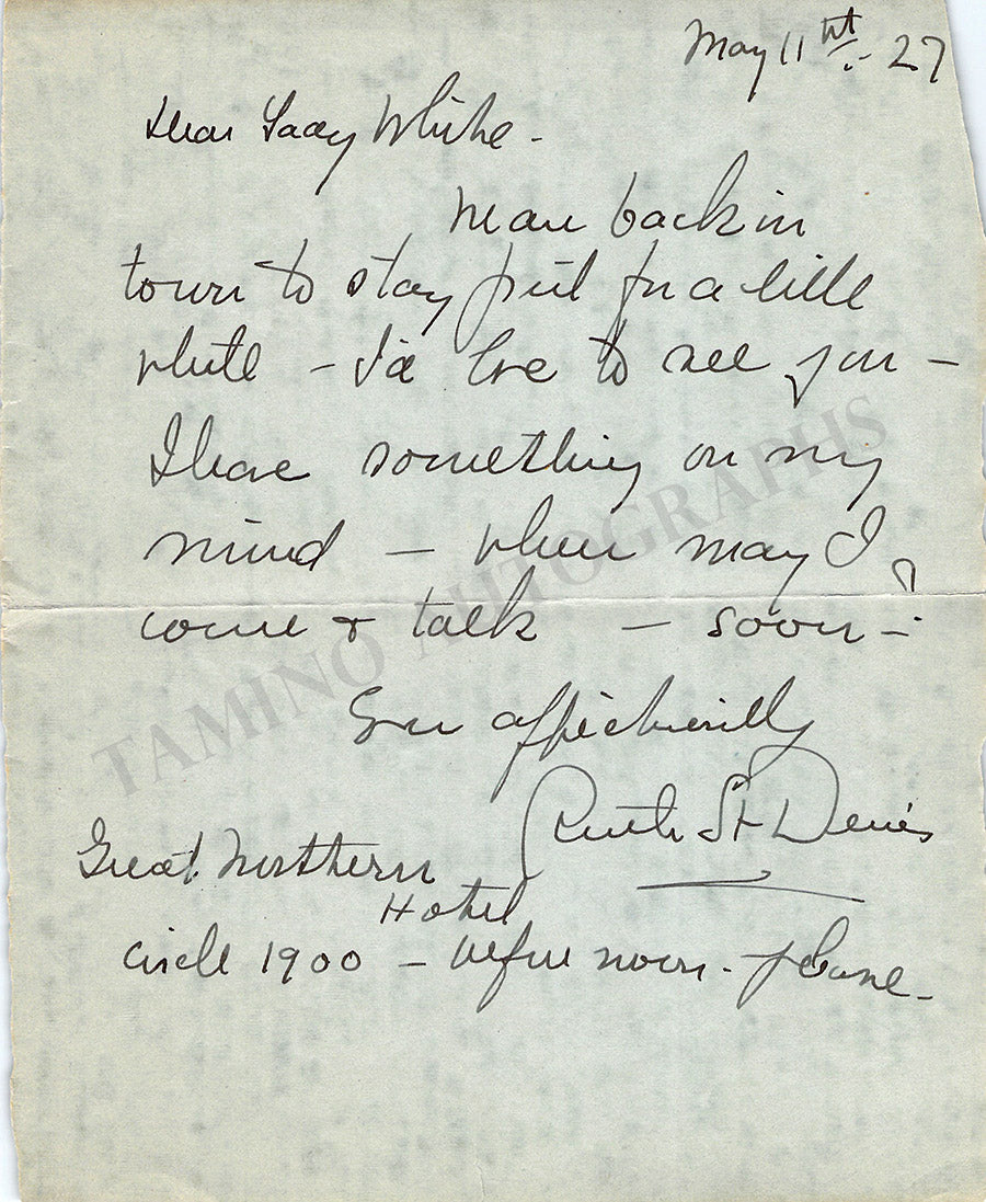 Autograph note in English signed by her, dated May 11, 1927. Size is 6 x 7.5 inches, 1 page, central fold, crack at the center, in overall good condition.