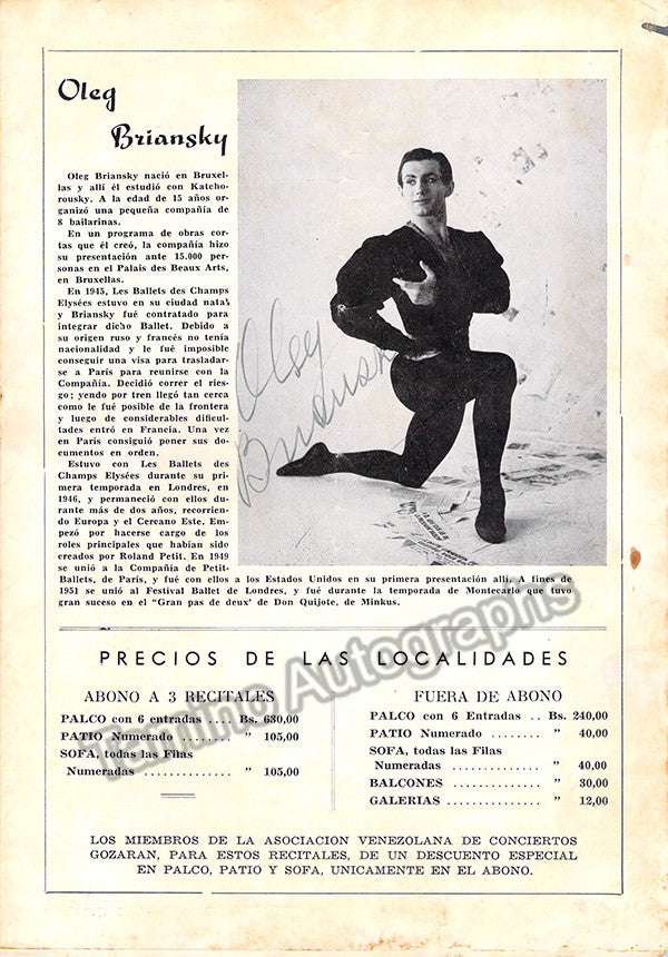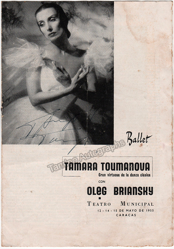 Signed program for a performance in Caracas, Venezuela, 1955. Toumanova signed on the cover, over her half-tone picture. Also signed by dancer Oleg Briansky in his cast page, over the photo. Size is 6.5 x 9.25 inches, full programs with all 4 internal pages and covers, in good condition.