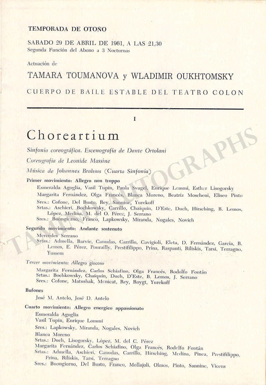 Program for a ballet performance of the star dancer at Teatro Colon on April 29, 1961, signed by her on his bio page. Size is 6.1 x 9.1 inches, full program in excellent condition.