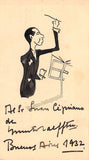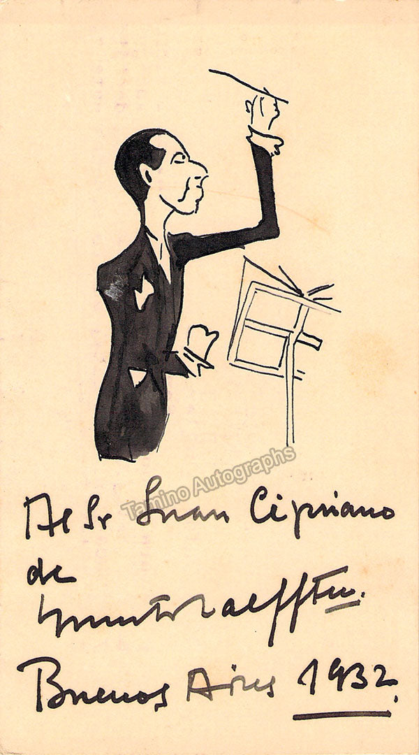 Spanish composer and conductor (1905-1989), set of 1 signed photograph with brief musical quote and another signed caricature of him, inscribed, both items dated in Buenos Aires in 1932. Each is sized 3.25 x 5.75 inches and are in excellent condition. Not sold separately.