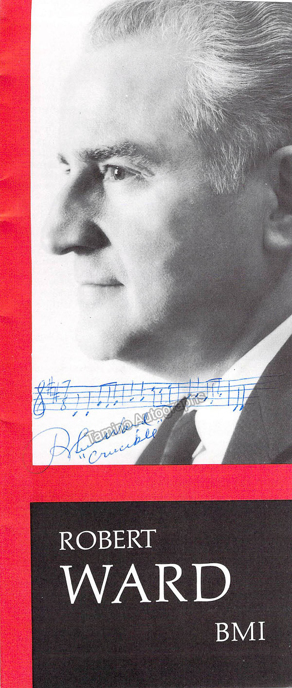Foldable brochure about him and his career signed on the front cover with a 4-bar from his opera "The Crucible". Size is 3.8 x 9 inches, in excellent condition.