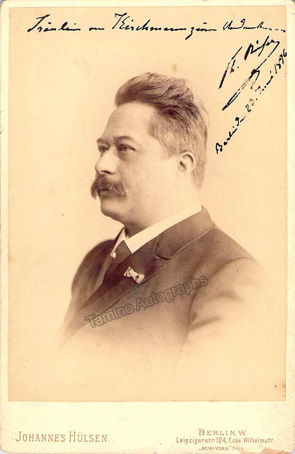 Nice cabinet photograph signed and inscribed by the composer, dated in Berlin, 1896; photo by Johannes Hulsen. Size is 4.25 x 6.4 inches, minor damage over lower right corner, otherwise in very good condition.