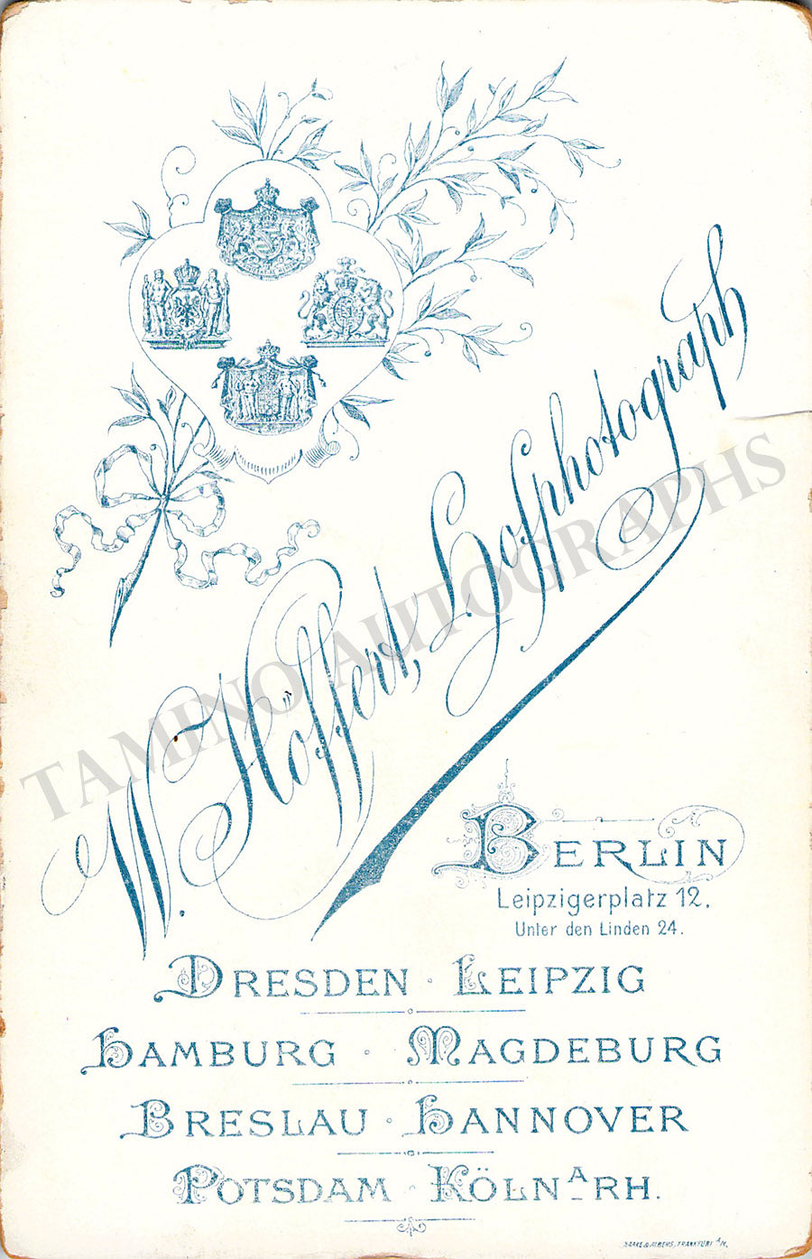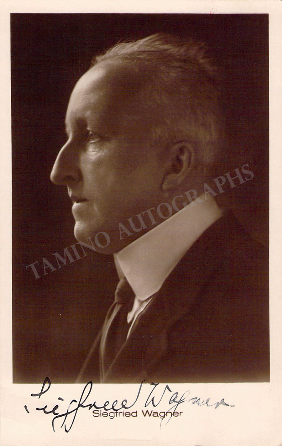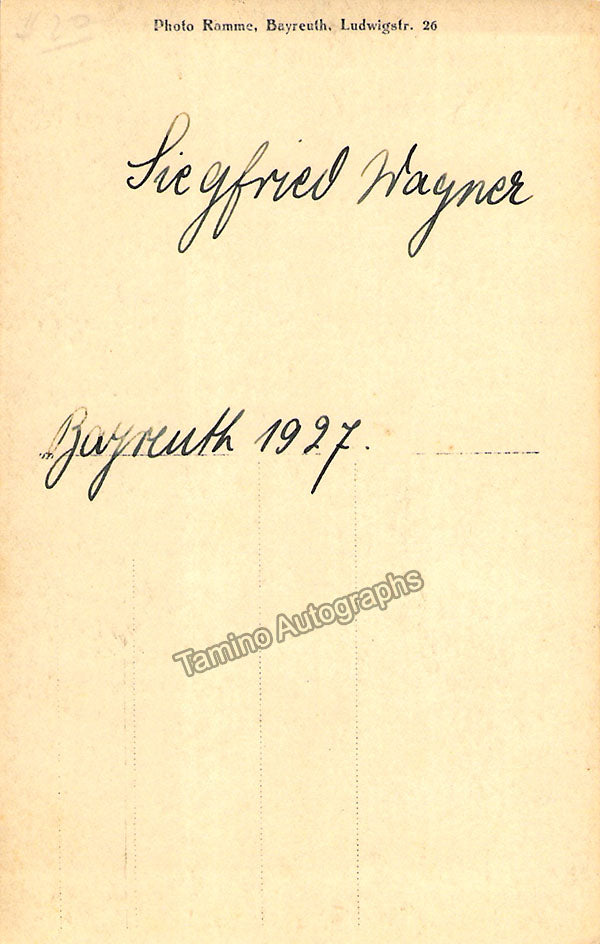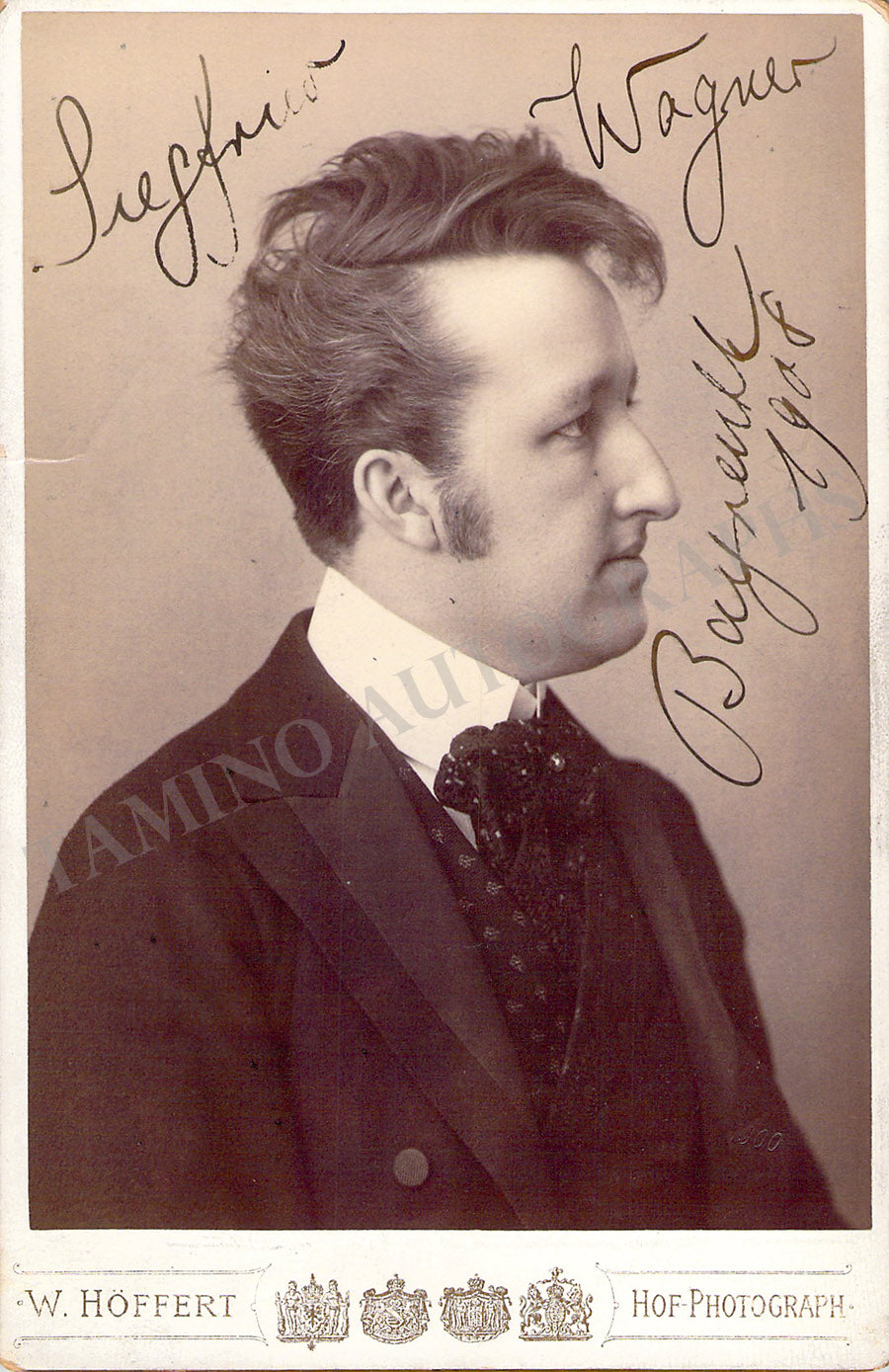 Black-and-white cabinet photo of him by photographer W. Hoffert signed by Siegfried and dated in Bayreuth, 1908. Size is 4.25 x 6.5 inches, small crease over the left border, otherwise in excellent condition.