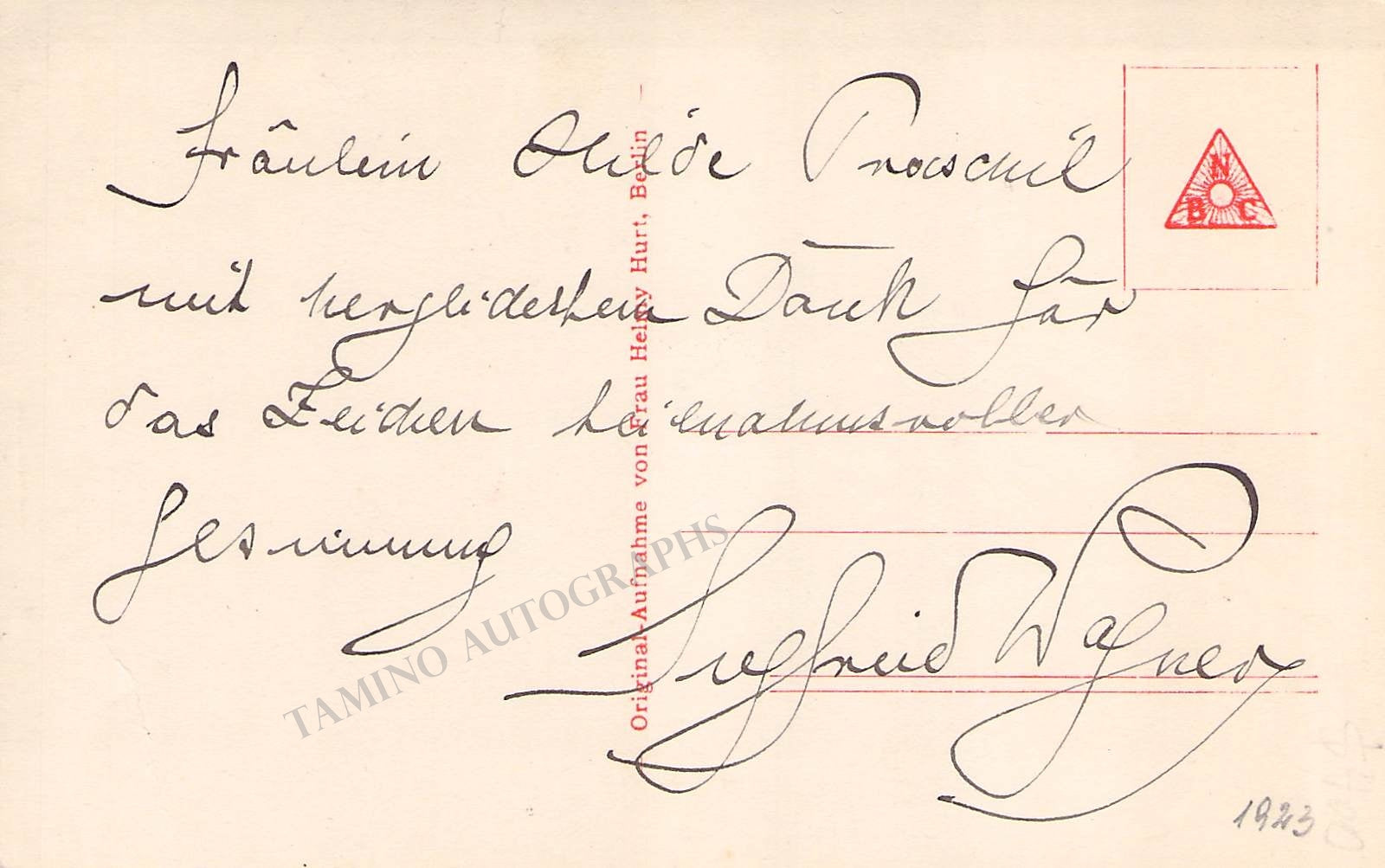 Signed postcard photograph with an additional signature and inscription by him on verso with a short sentiment in German. Size is 3.5 x 5.25 inches, some bends, otherwise in excellent condition.