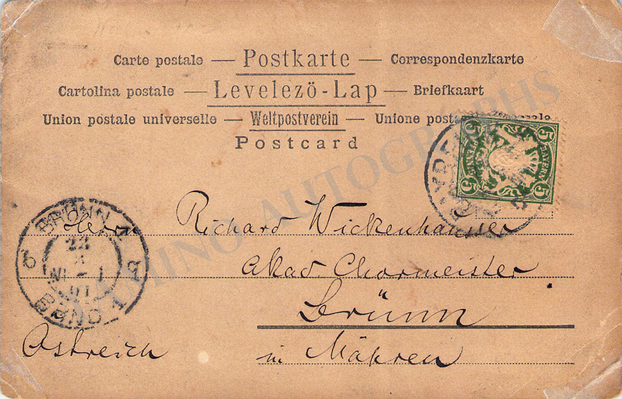 Black-and-white photo postcard signed and inscribed by him with a long sentiment in German, shown young. Postal markings indicate the year 1901. Size is 3.5 x 5.5 inches, creases in all four corners, some silvering, in very good condition.