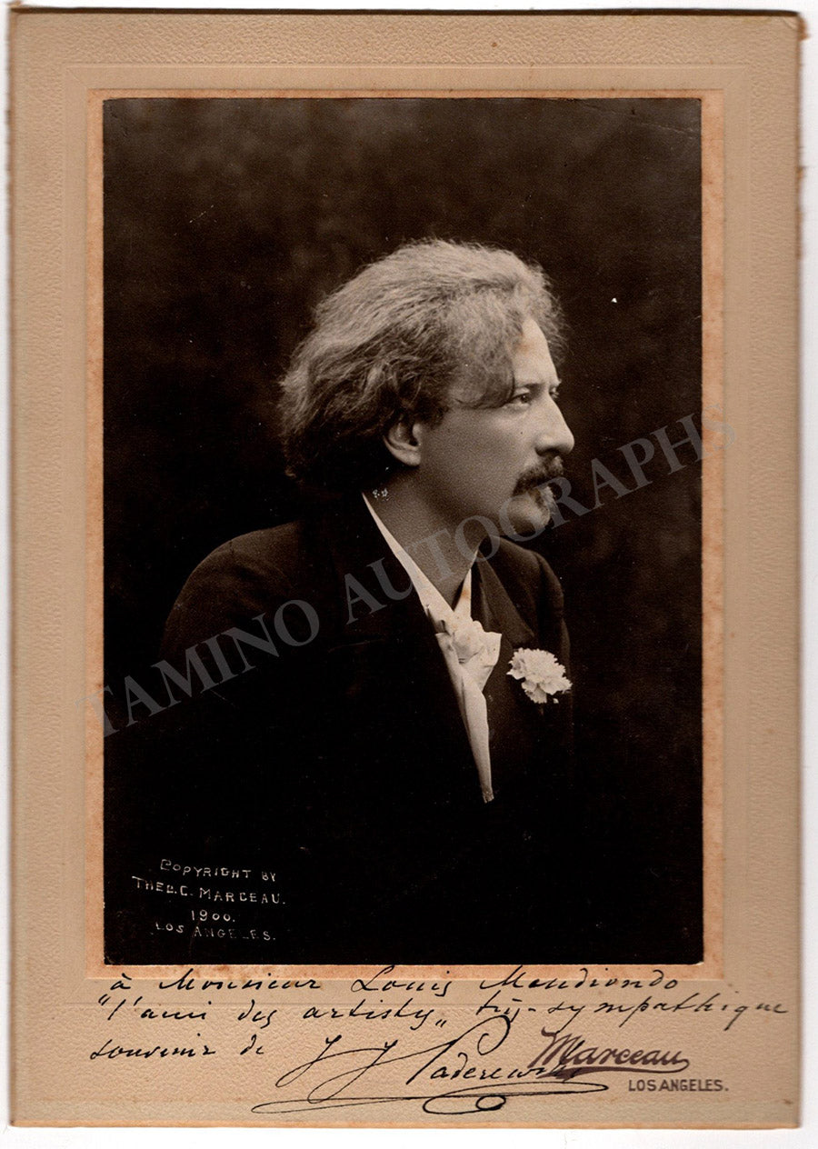 Fine black-and-white photograph signed and inscribed by him with a short sentiment in French, shown young, mounted on a photographer mat by Marceau (Los Angeles).