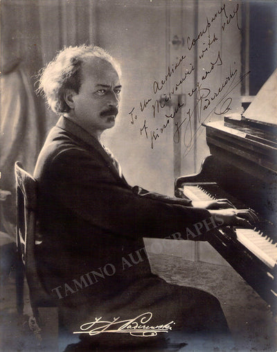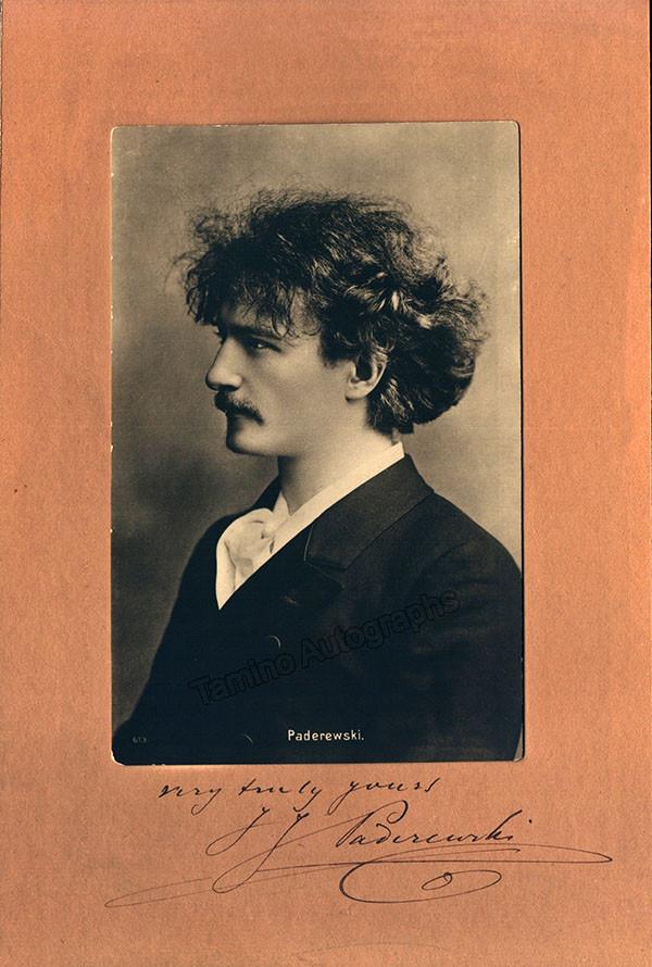 Nice black-and-white photo postcard mounted on a mat, signed by Paderewski just below. Total size is 5 x 8.25 inches, in excellent condition