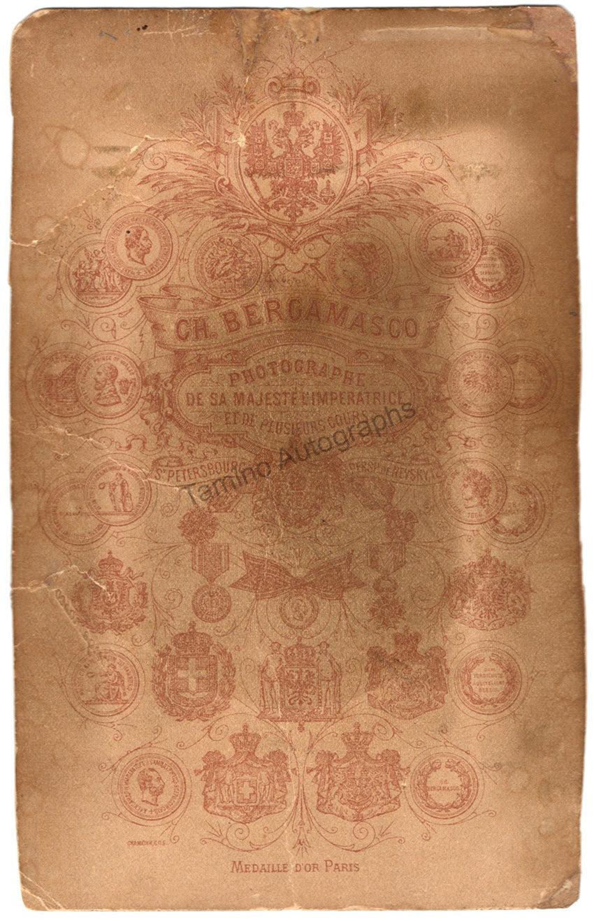 Size is 4.1 x 6.6 inches, an original cabinet photo by Bergamasco, St. Petersburg. Repaired cracks and loss of paper at the top center, not affecting the signature, rust on verso and irregular borders, but in overall good condition.