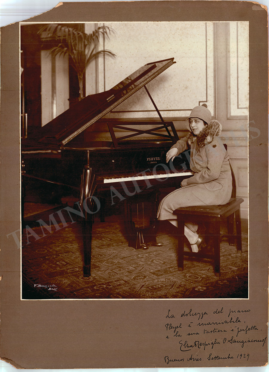 Beautiful photograph by Dixio mounted on a mat, signed and inscribed by Respighi with a short sentiment in Italian dated in Buenos Aires, 1929, shown at the piano. Total size is 18.5 x 24.4 inches, missing corners, in overall very good condition.