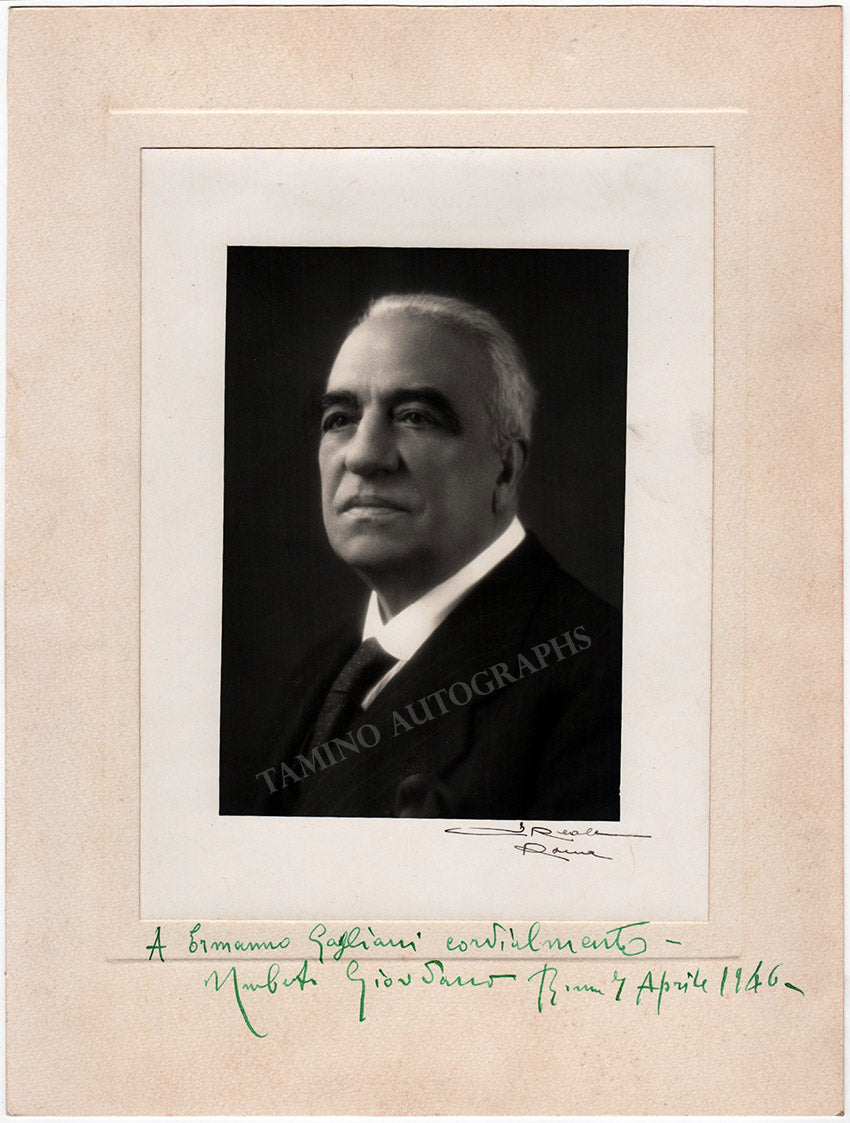 Stunning photograph whose mat is signed by the great composer and dated by him in Rome, 1946. Photo is also signed by photographer F. Reale, Rome.  Total size is 9.75 x 13 inches, photograph is 6.75 x 9 inches, in excellent condition.