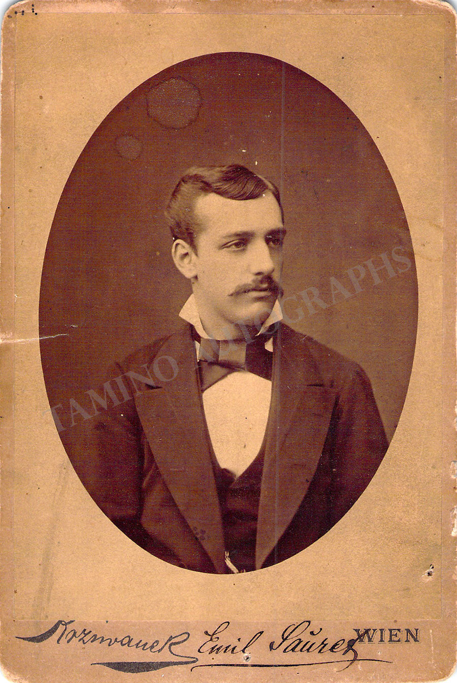 Beautiful cabinet photograph of the violinist by photographer R. Krziwanek (Vienna) signed by Sauret at the bottom. Size is 4.5 x 6.5 inches, in very good condition.