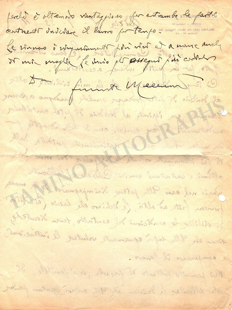 Autograph letter in Italian (untranslated) signed by him and dated 1933 requesting a musical collaboration with Teatro alla Scala. Size is 8.6 x 11.4 inches approx., 2 written pages, central fold, overall rust and dirt stains, in very good condition.