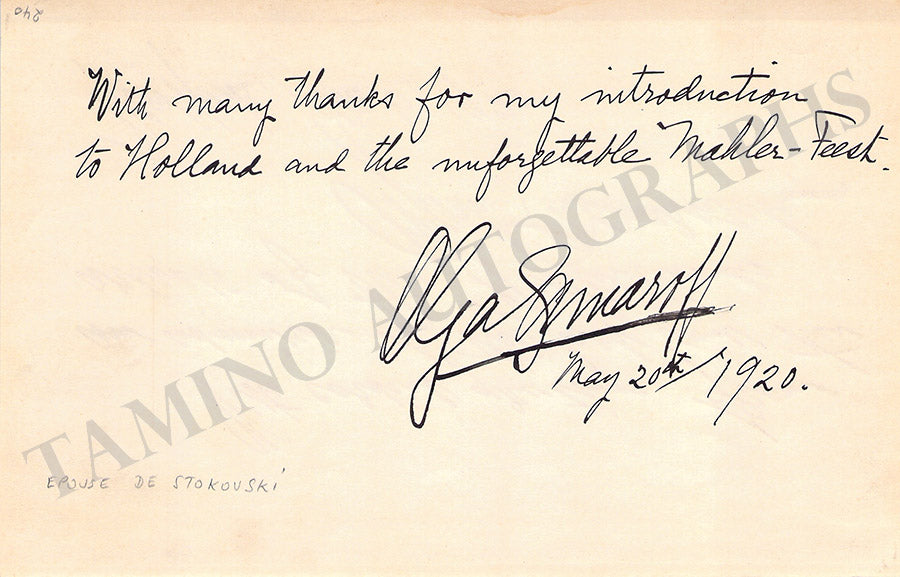Album page signed by him with a short sentiment dated in New York, January 6, 1920.  On verso, the album page is also signed with a short sentiment dated May 20, 1920, by the American pianist Olga Samaroff, pupil of Charles-Valentin Alkan. Size is 7.8 x 5 inches, in excellent condition.