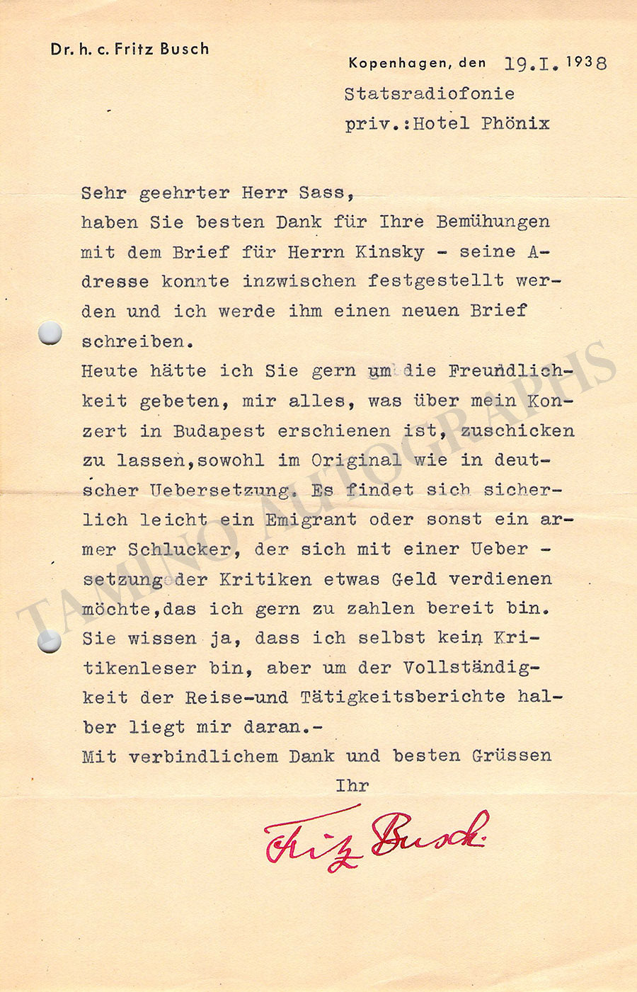 Typed letter in German signed by him, dated in Copenhaguen, 1938, addressing a certain Mr. Sass requesting the reviews of his concert in Budapest. Size is 5.7 x 8.9 inches, storage holes, central fold, in excellent condition.