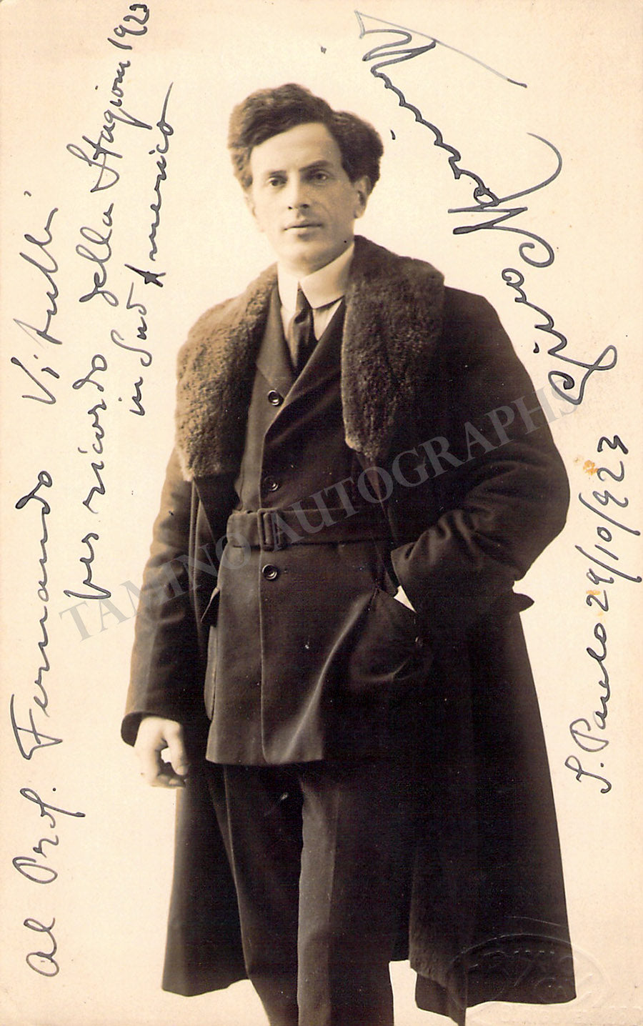 Black-and-white photo postcard signed and inscribed by him with a short sentiment in Italian, shown young, dated in San Pablo (Brazil), 1923; blind-stamped on the front by photographer Bixio (Buenos Aires). Size is 3.4 x 5.4 inches, in very good condition.