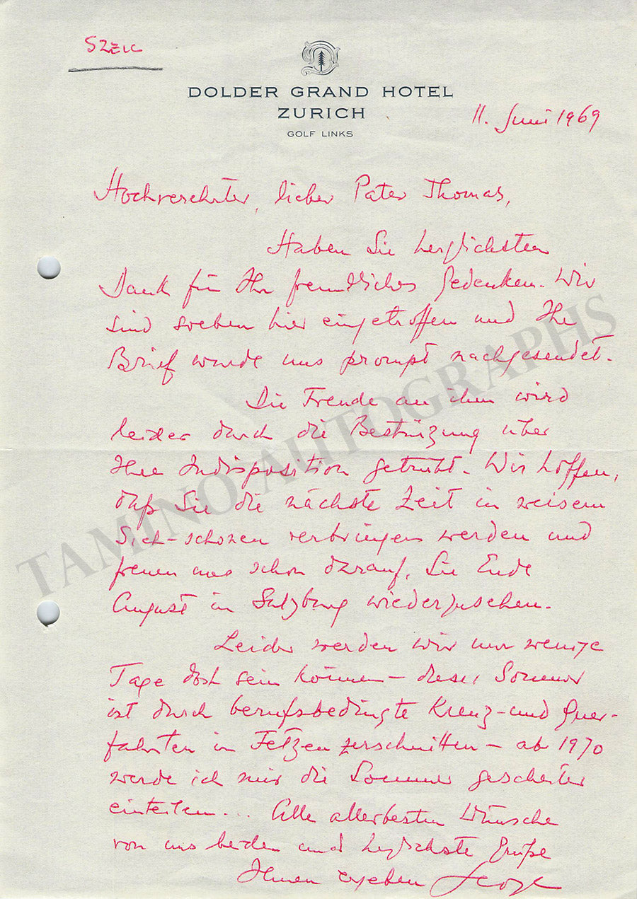 Autograph letter in German signed by him and dated 1969, to composer Peter Thomas (1925-2020), concerning an upcoming meeting in Salzburg. Size is 5.8 x 8.2 inches, 1 page, storage holes, central fold, in overall excellent condition.