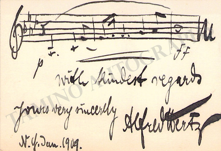 Original business card of music fan Gladys Greeley signed by conductor Alfred Hertz with a short greeting on the back and a 3-bar music quote signed by him dated in New York 1909. Size is 2.8 x 2 inches, in excellent condition.
