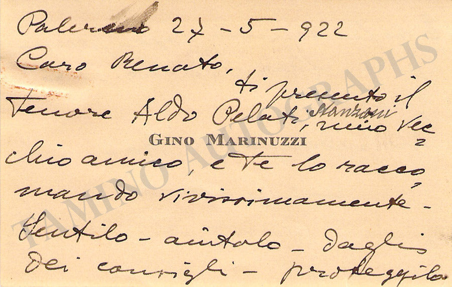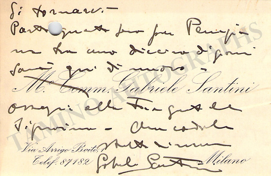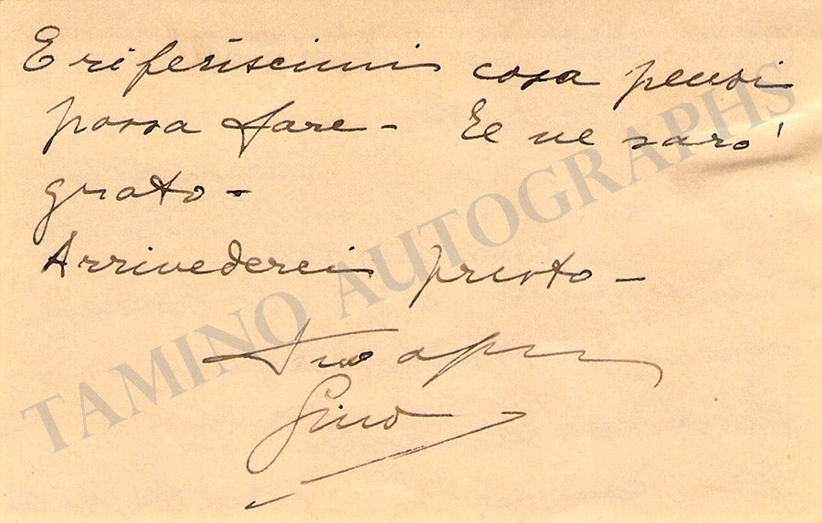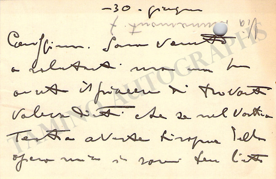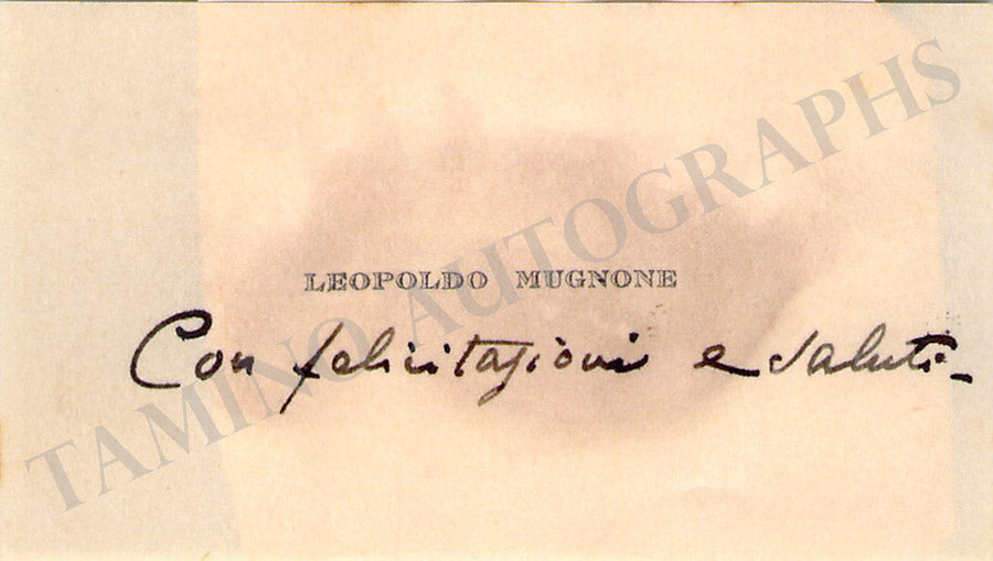 His printed business card with a short greeting in Italian written by him. Size is 3.6 x 2.1 inches, mounted on a piece of paper, in very good condition.
