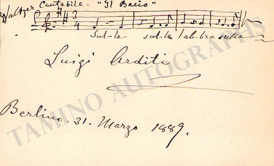 Fine card signed by him with a 4-bar music quote from his most celebrated song 'Il Bacio', dated in Berlin, 1889. Size is 3.75 x 2.3 inches, in excellent condition.