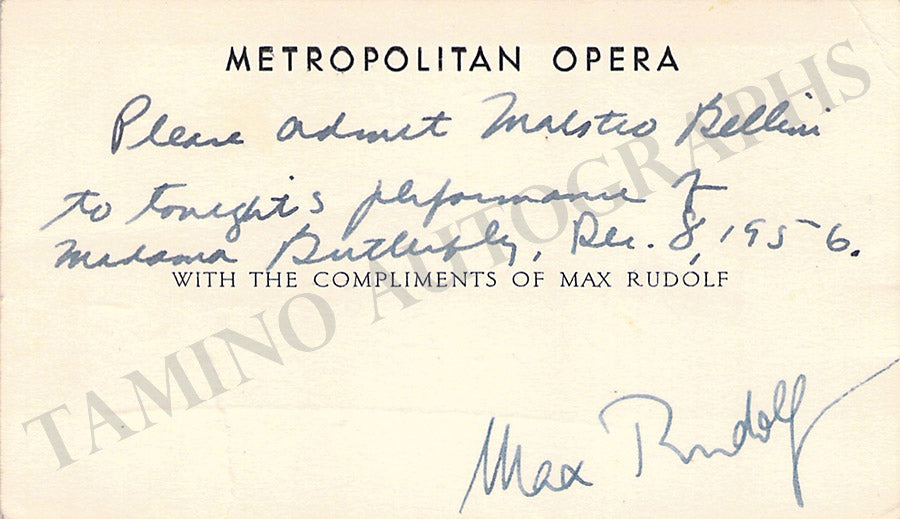 His Metropolitan Opera business card signed by him authorizing the admission to a fellow conductor for a rehearsal of Madame Butterfly in 1956. Size is 3.9 x 2.3 inches, small crack, ink markings on verso, in very good condition.