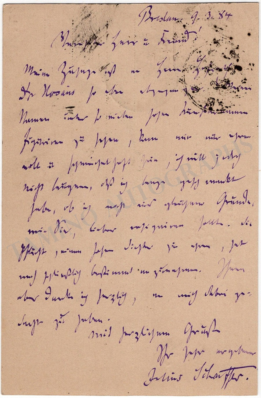 Autograph letter in German (untranslated) on a postcard signed by him, dated March 9, 1884, where he addresses the musicologist Max Friedlaender (1852-1934), concerning music matters. Size is 3.6 x 5.5 inches, some ink stains at the top caused by the postal mark, otherwise in very good condition.
