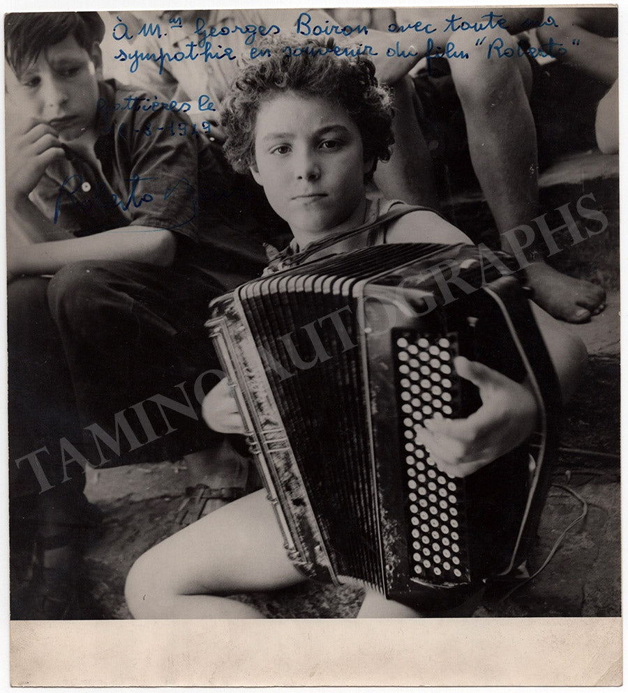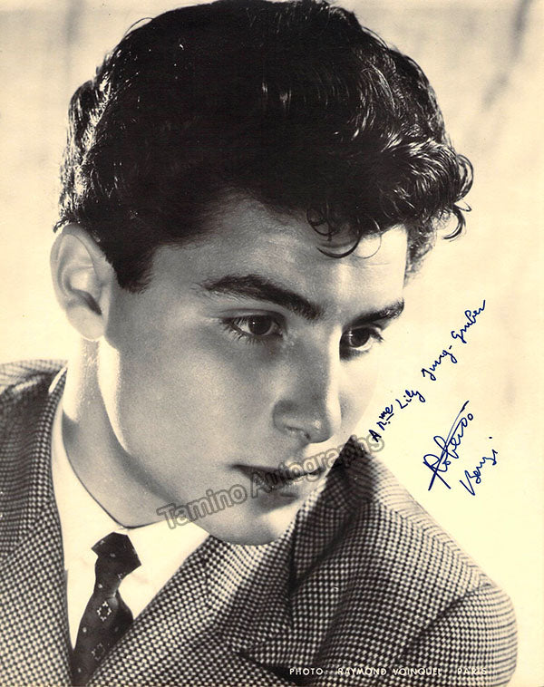 Beautiful and rare black-and-white photograph signed by him and dated August 18, 1949, shown here as a teenager in the role of Roberto on the set of Lacombe's drama film Prélude à la Gloire (1948). Size is 7.5 x 8 inches, in excellent condition.
