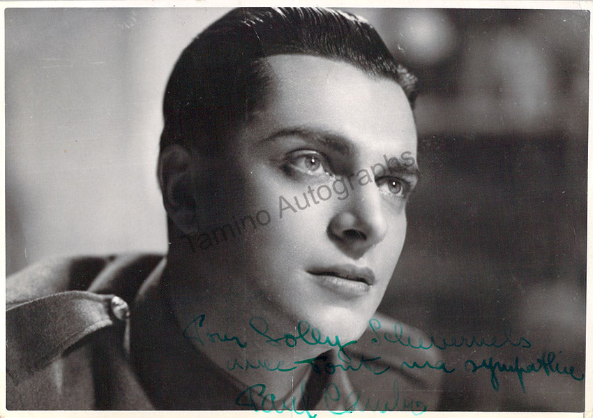 French actor (1908-1978), active in films between 1932-1975. Great black and white movie-still photograph signed and inscribed by him with a short sentiment. Size is 6.8 x 4.8 inches, minor creases, in very good condition.