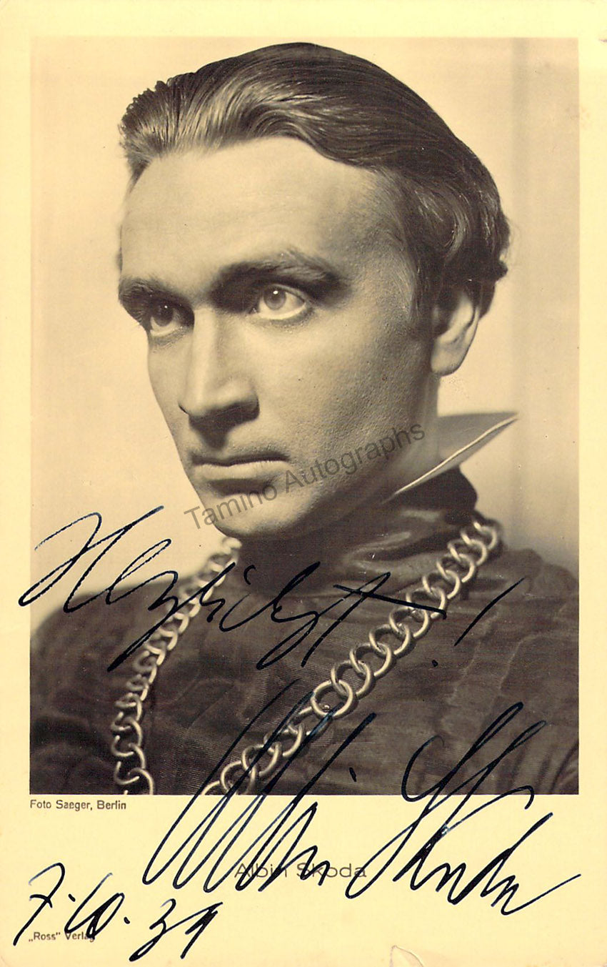 Austrian actor (1909-1961). Beautiful photo postcard signed by him shown in role, dated in 1939. Size is 3.5 x 5.5 inches, in excellent condition.