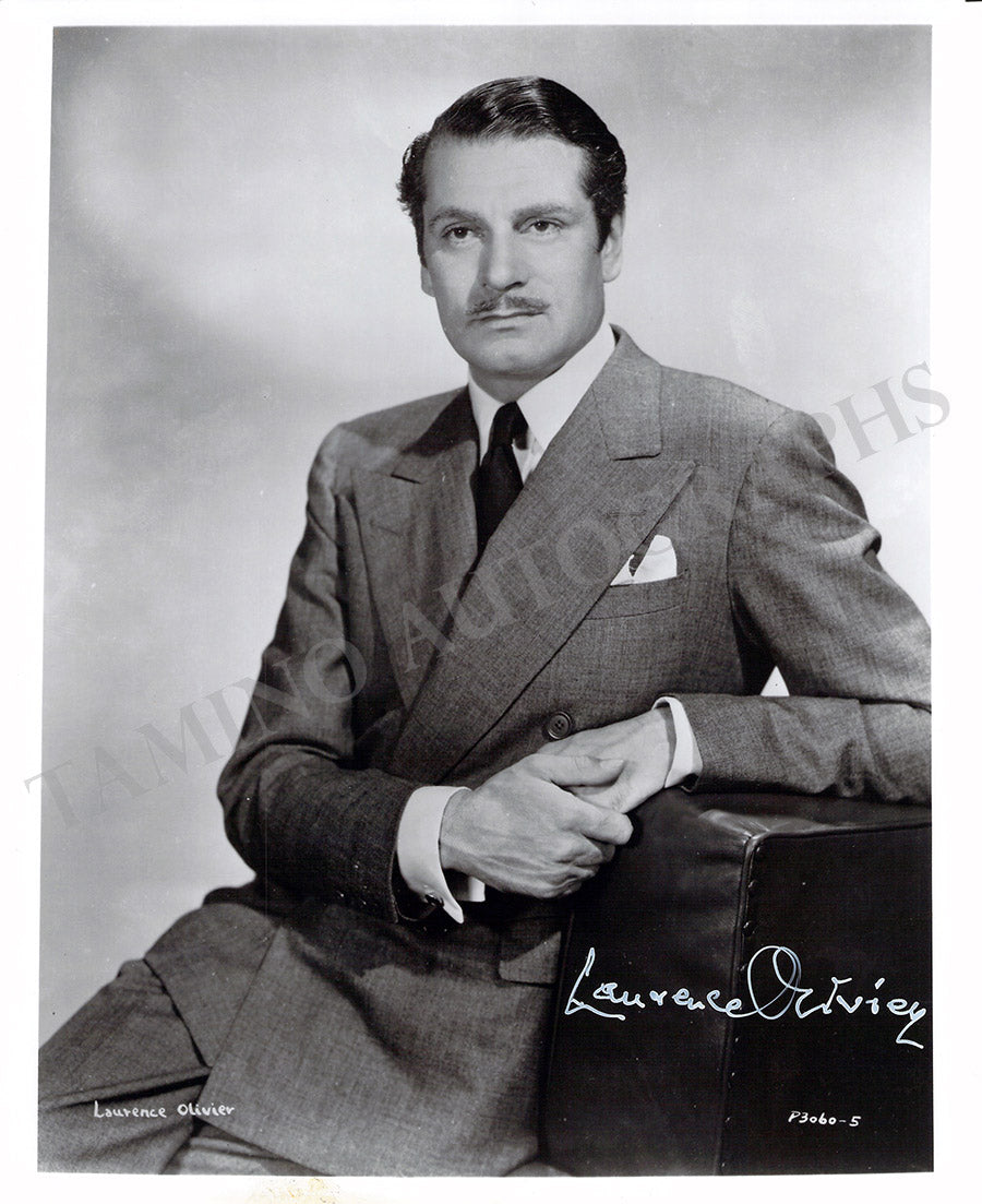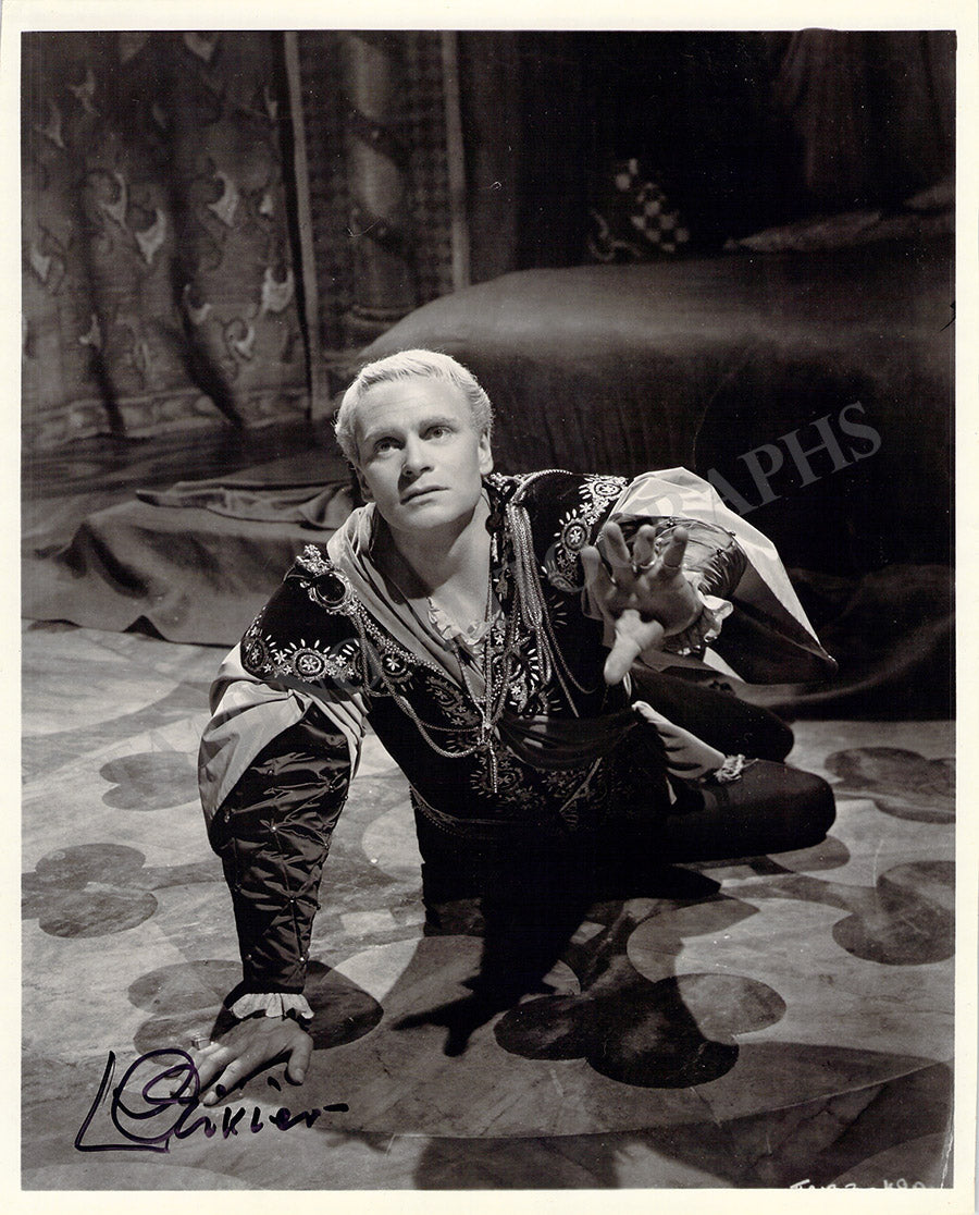 Gorgeous black-and-white photograph signed by him, shown in the film 'Hamlet'. Size is 8 x 9.9 inches, mounting traces on verso, minor creases, in very good condition.