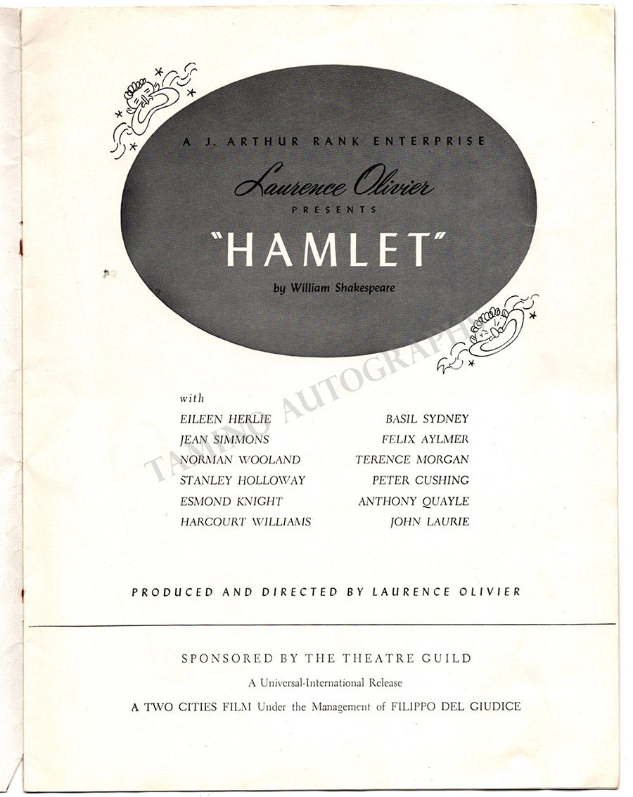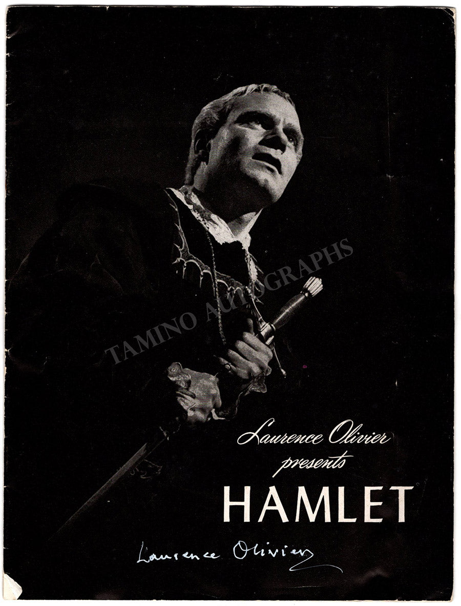 Program/brochure for the British film adaptation of Shakespeare's play 'Hamlet' produced and starred by him in 1948, signed in white ink by the star actor.