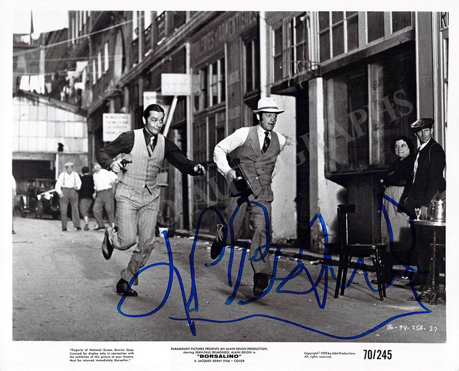 Black-and-white movie-still promo photograph of the film Borsalino (1970) signed by him with a blue felt tip pen in his elder years. Size is 10 x 8.1 inches, in excellent condition.