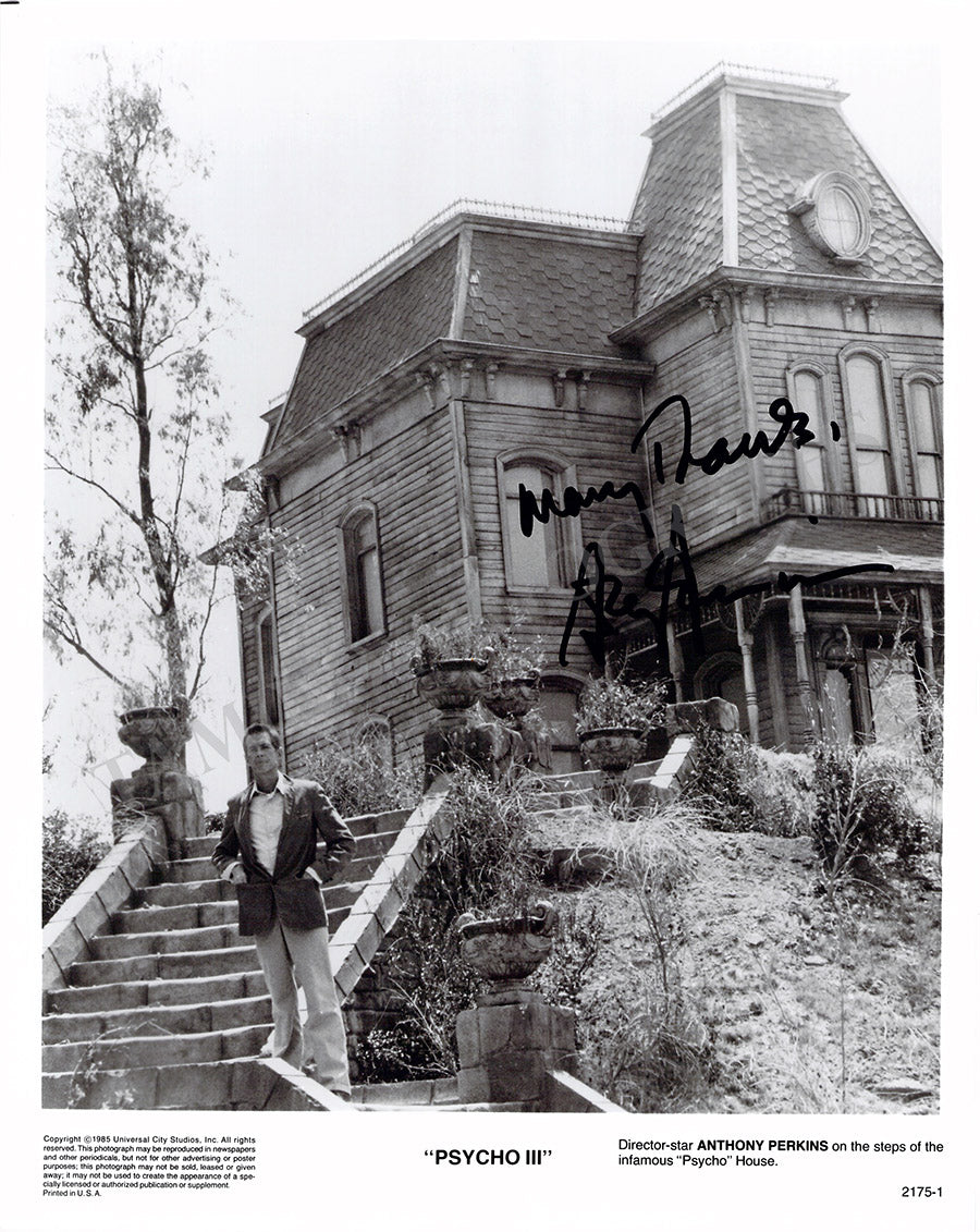 Black-and-white movie-still photograph of the film 'Psycho 3' (1985) signed by him. Size is 7.9 x 10 inches, in excellent condition.