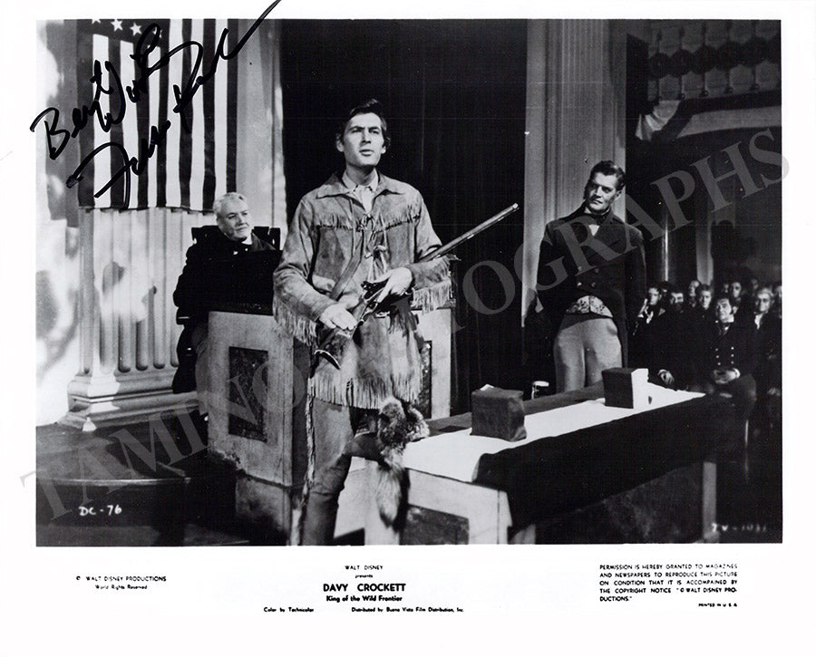 Black-and-white movie-still photograph of the TV series Davy Crockett signed by him in 1989. Size is 7.9 x 10.5 inches, in excellent condition.