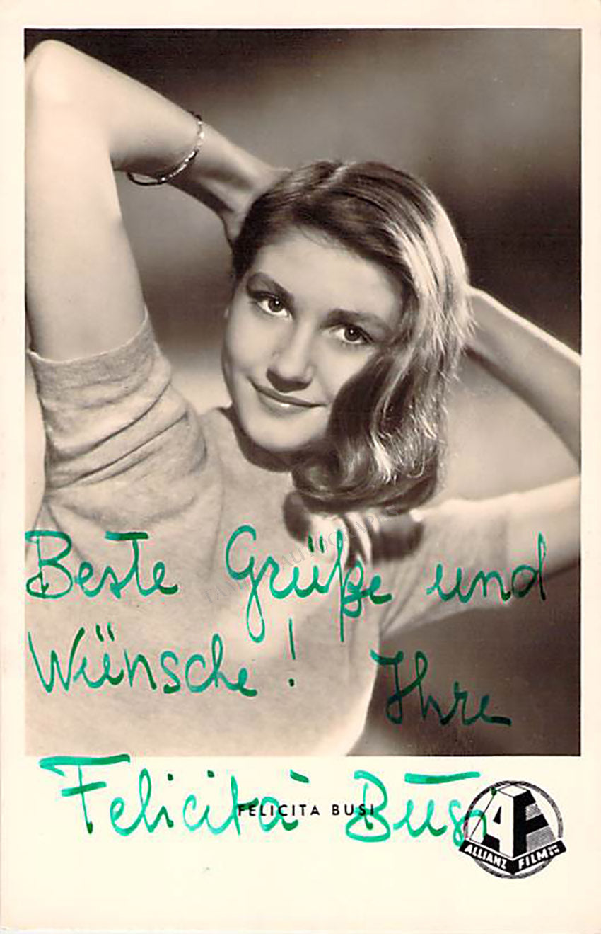 Black-and-white promo photo postcard signed by her with a short sentiment in German, shown young. Size is 3.5 x 5.5 inches, in excellent condition.