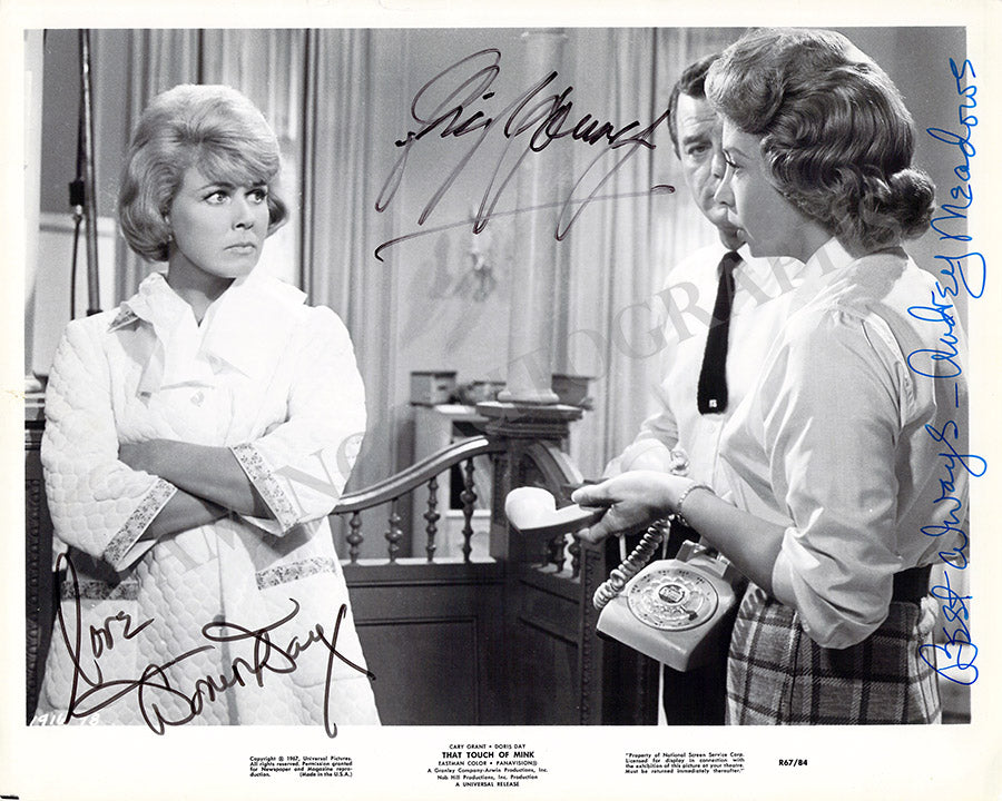 Fine black-and-white promo movie-still photograph of the film "That Touch of Mink" (1962) signed by both actresses and Gig Young. Size is 10.1 x 8 inches, minor creases, in excellent condition.