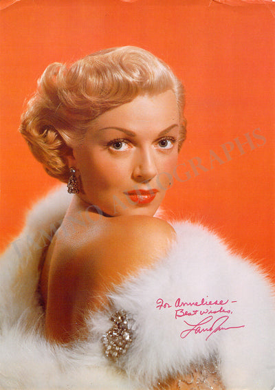 Gorgeous color movie-still photograph signed by her, shown in a film. Size is 7.9 x 10 inches, in excellent condition.