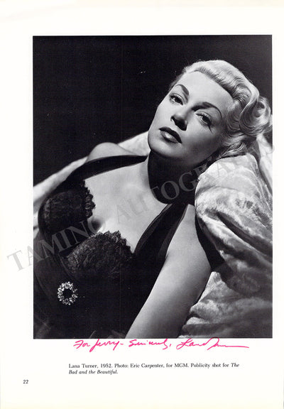 Beautiful black-and-white half-tone photograph (a page from a Magazine) -a publicity shot for the film The Bad and the Beautiful (1952) signed and inscribed by her with a short sentiment. Size is 7.7 x 11.1 inches, in excellent condition.