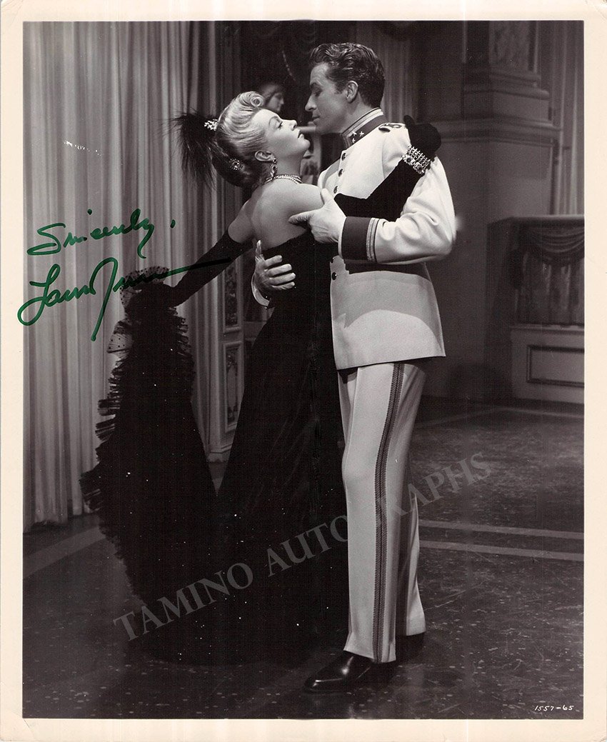 Nice black-and-white movie-still photograph of the famous musical film 'The Merry Widow' (1952) signed by her, shown next to Fernando Lamas. Size is 8 x 10 inches, minor scratch otherwise in very good condition.