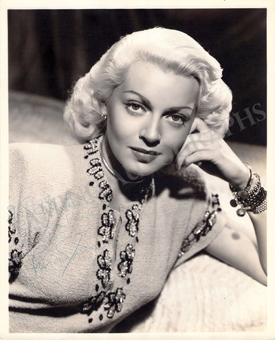 Beautiful black-and-white glamour photograph signed and inscribed by her with a short sentiment (a bit faded, still visible). Size is 8 x 9.9 inches, in excellent condition.