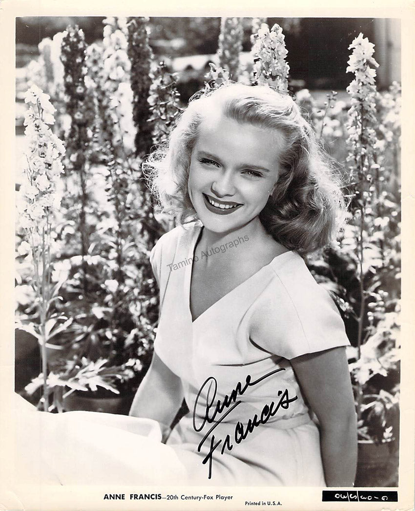 Nice black-and-white promo photograph of the actress by 20th Century Fox, signed by her. Size is 8 x 9.9 inches, in excellent condition.