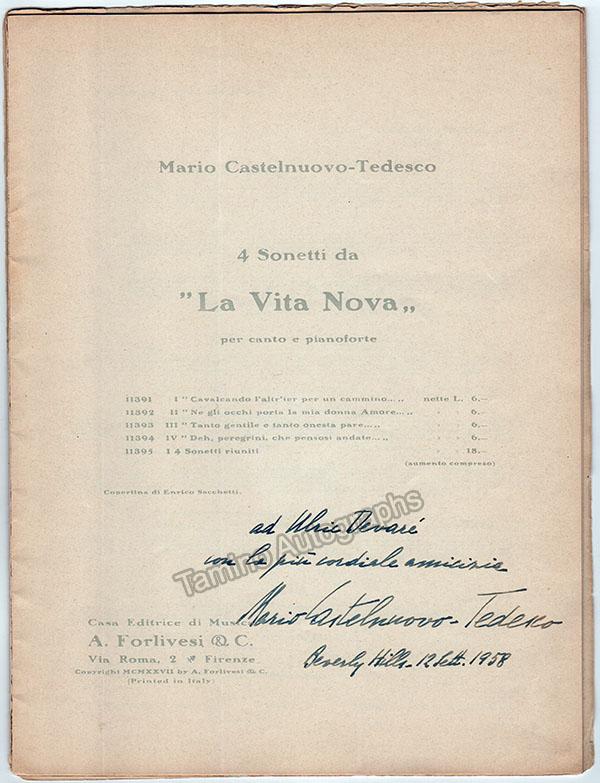 Printed score for the piece "La Vita Nova" for piano and voice, signed and inscribed by him on the first page, dated in Beverly Hills, California, 1958.  Size is 9 x 12 inches, full score with all pages and covers (front cover is loose), minor rust on edges, in very good condition.