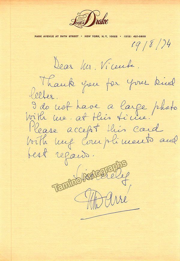 Short autograph note in English signed by her in 1974, thanking a fan. Size is 7.25 x 10.5 inches, 1 page, in excellent condition.