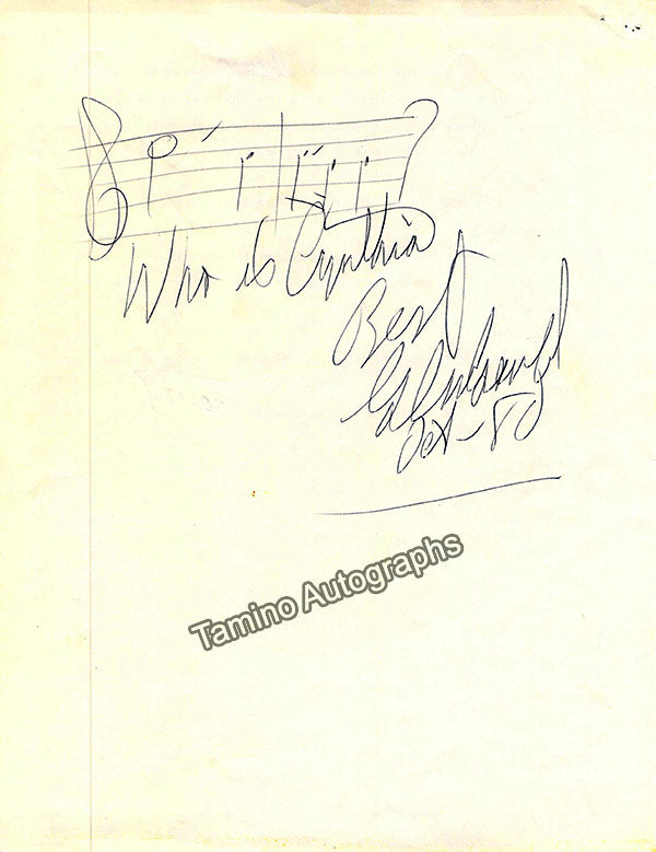 2-bar autograph music quote signed and inscribed by him with a short sentiment dated 1980 made on the back of the last page of a partial transcription of an interview for a radio program in October 1980 at CBC.  Size is 8.5 x 11 inches, 1 page, in excellent condition.