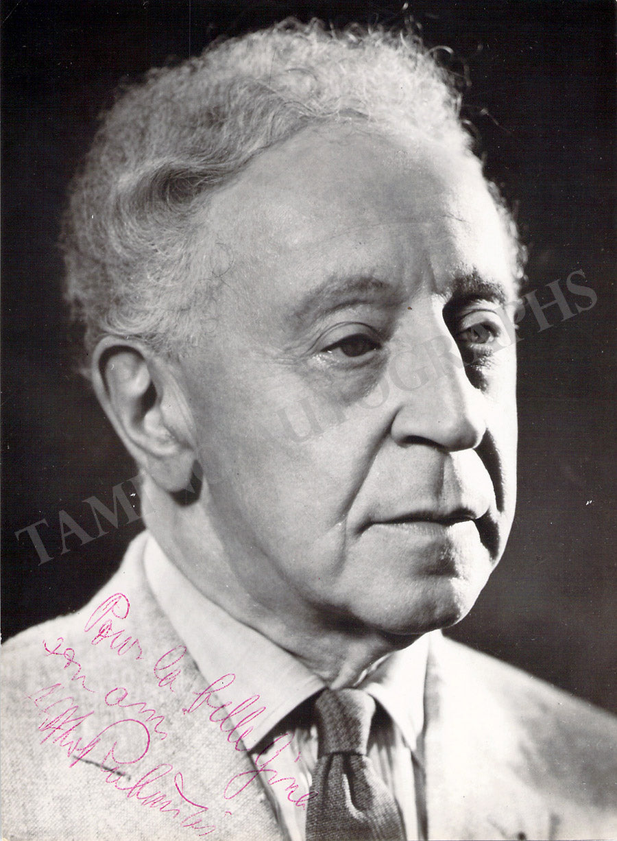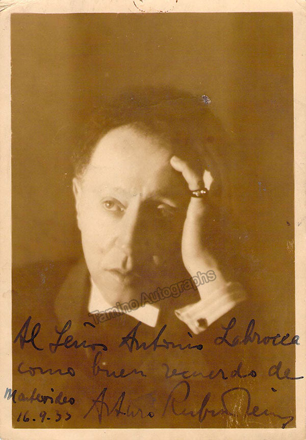 Fine sepia photograph signed and inscribed by him with a short sentiment dated in Montevideo in 1937; sticker on verso by photographer Wilenski (Buenos Aires). Size is 3.8 x 5.6 inches, some creases, in overall very good condition.