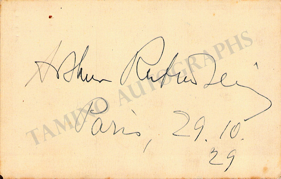 Fine card signed by him, dated in Paris, 1929. Size is 5.5 x 3.5 inches, minor stains, in excellent condition.