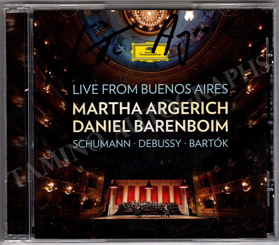 Nice CD album 'Live from Buenos Aires 2015' featuring pianists Argerich and Daniel Barenboim signed by Argerich on the front cover insert. Size is 5.6 x 4.8 inches, in excellent condition.