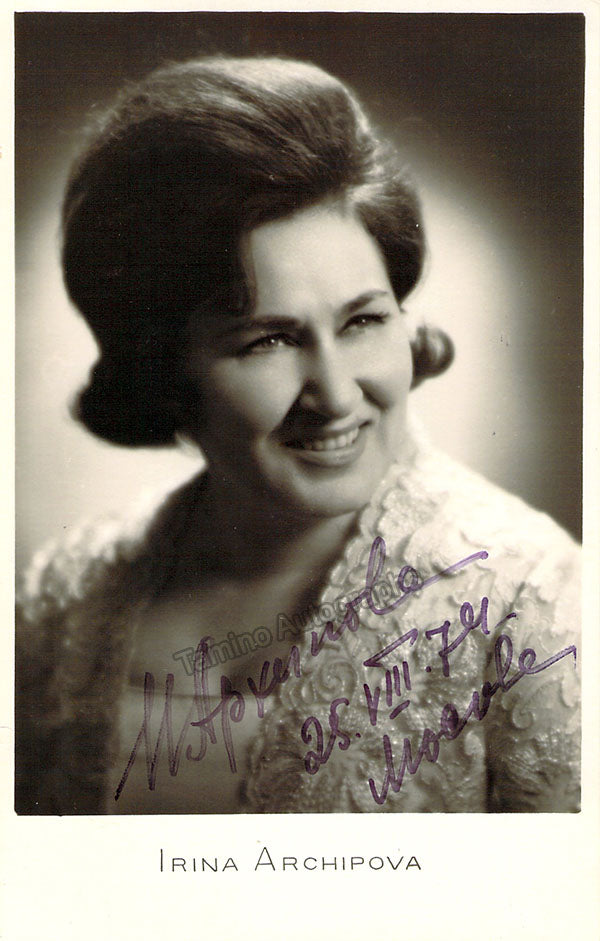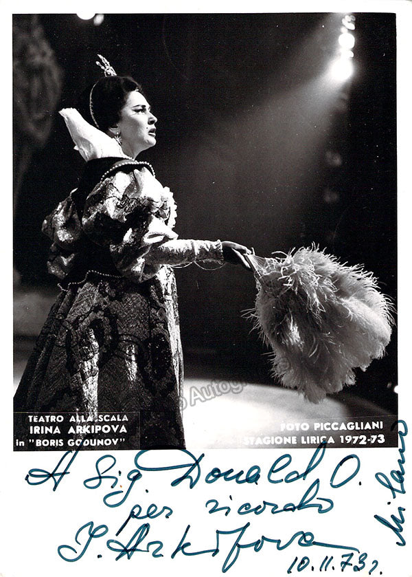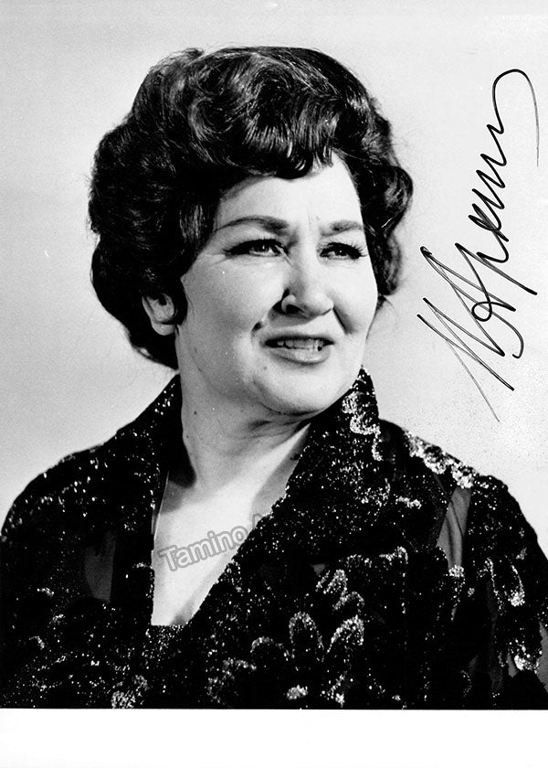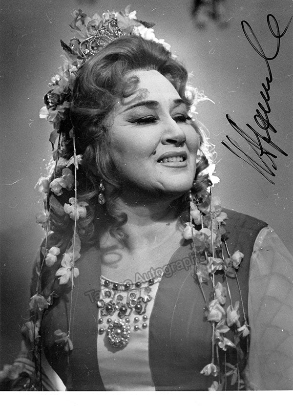 Signed photograph, shown as Marina in Mussorgsky's Boris Godunov at La Scala, Milan, inscribed and dated in 1973. Stamped on verso by photorapher Piccagliani, La Scala, Milan. Size is 4 x 5.75 inches, in excellent condition.