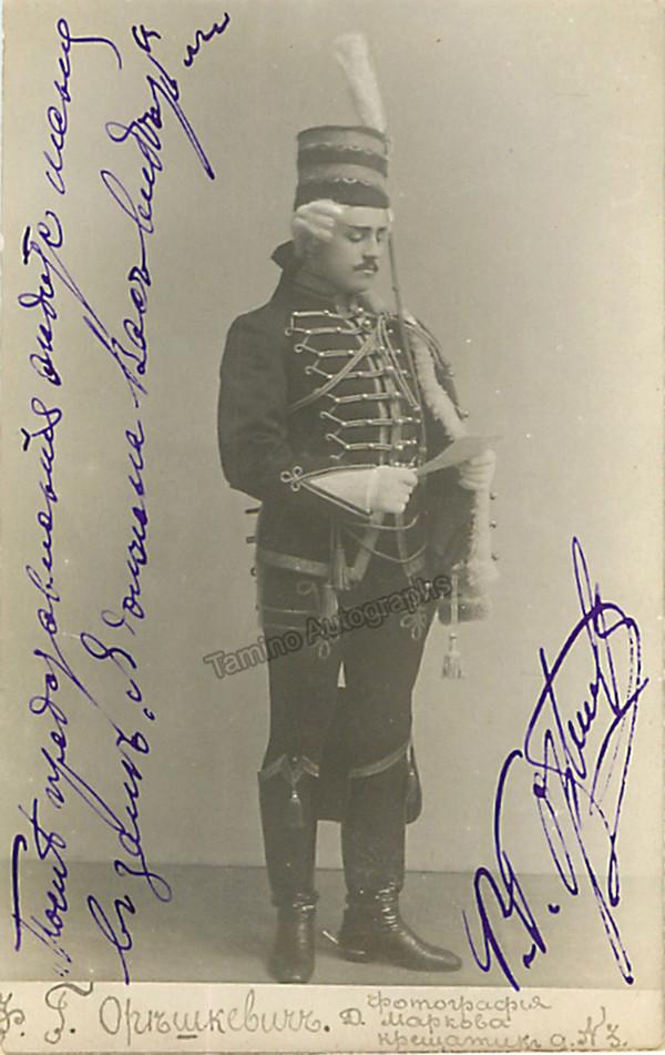 Ukrainian tenor (1872-1932), signed photo postcard, shown in role. Inscribed with a long sentiment. Size is 3.5 x 5.5 inches, in excellent condition.