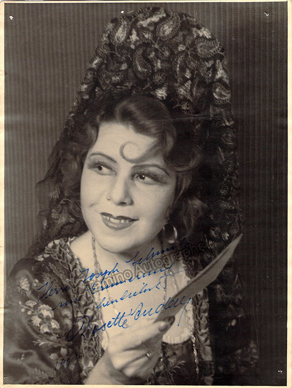 Signed photograph, shown in the title role of Bizet's Carmen, inscribed. Size is 7 x 9.5 inches, in very good condition.