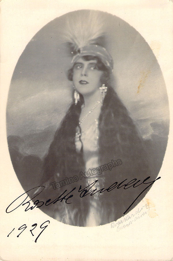 Signed photograph, shown as herself, dated in 1929. Stamped on verso by photographer Melitta Lang, Buenos Aires. Size is 6.75 x 9.25 inches, crease on bottom right, otherwise in good condition.